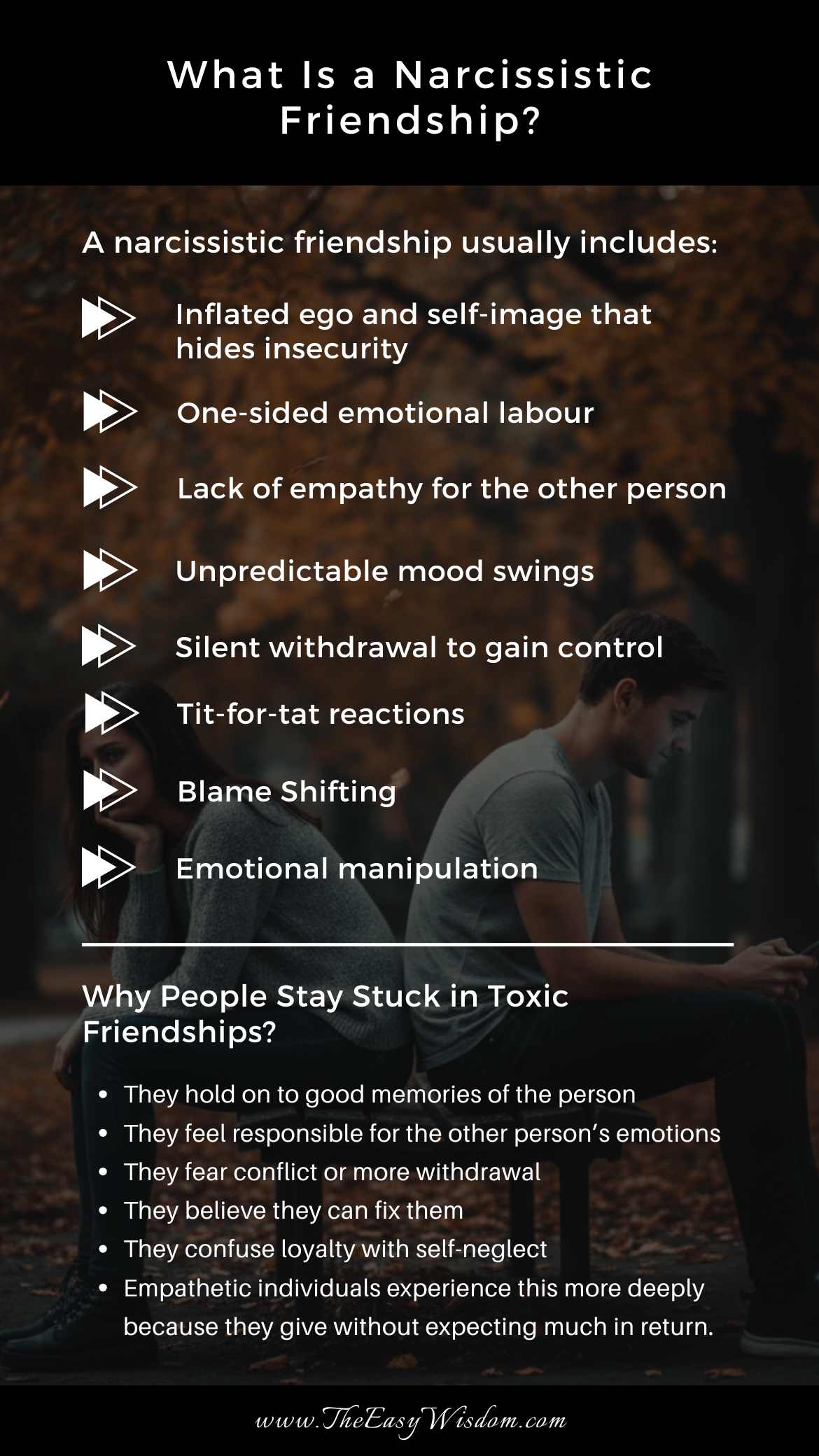 Narcissistic Friendship is one of the most draining forms of emotional attachment. It looks warm in the beginning, but slowly turns into a space where one person gives, absorbs, adjusts, and carries the entire weight of the bond. Many people stay trapped in a Narcissistic Friendship because the early affection feels genuine, the connection feels rare, and the good memories keep them hopeful. But over time, emotional imbalance, manipulation, mood swings, and silent withdrawal start damaging the person who cares the most. This kind of toxic friendship blurs the line between loyalty and self-neglect. It makes you question your worth, your intentions, and your reality. And by the time you recognise the pattern, you’re already exhausted.